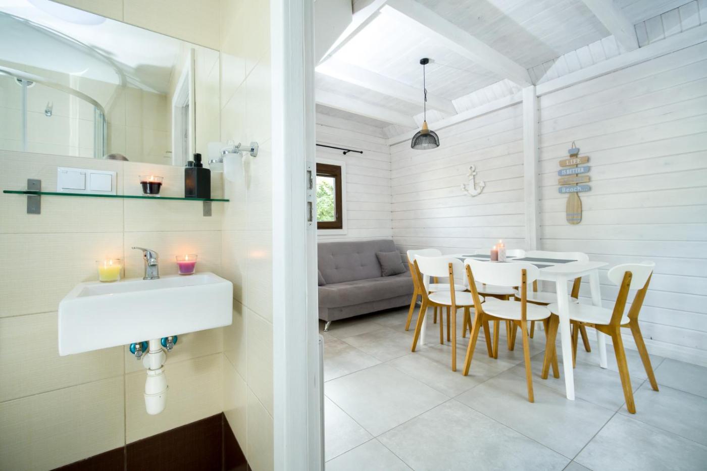 Domek z 2 sypialniami. This chalet provides a sauna. Boasting a private entrance, this chalet includes 1 living room, 2 separate bedrooms and 1 bathroom with a walk-in shower. Guests will find a stovetop, a refrigerator, a dishwasher and kitchenware in the well-equipped kitchen. The chalet also features a barbecue. Featuring a terrace with garden views, this chalet also offers a washing machine and a flat-screen TV with cable channels. The unit has 4 beds. Domek - 6 osobowy. Powierzchnia pokoju ok.: 40 mkw.